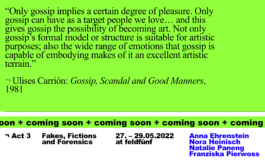Der Begriff ‘gossip' erinnert an Hochglanzmagazine, an Schulhofdramen, an Kaffeeklatsch unter Nachbarinnen oder Müttern. Gossip hat einen schlechten Ruf; nicht umsonst bezeichnete George Harrison gossip als "the devil's radio". Aber gossip ist auch Aktivismus; er ist ein uraltes Instrument der weiblichen Wissensproduktion. Obwohl daher (oft) politisch, kann gossip auch Spaß machen, kann wild und verführerisch sein. Fakes, Fictions, and Forensics hinterfragt wahrgenommene Normalität(en) in diesem Kontext und konzentriert sich auf weibliche Identitäten – auf die Fakes und Fiktionen, Realitäten und Wahrnehmungen, die sie ausmachen.